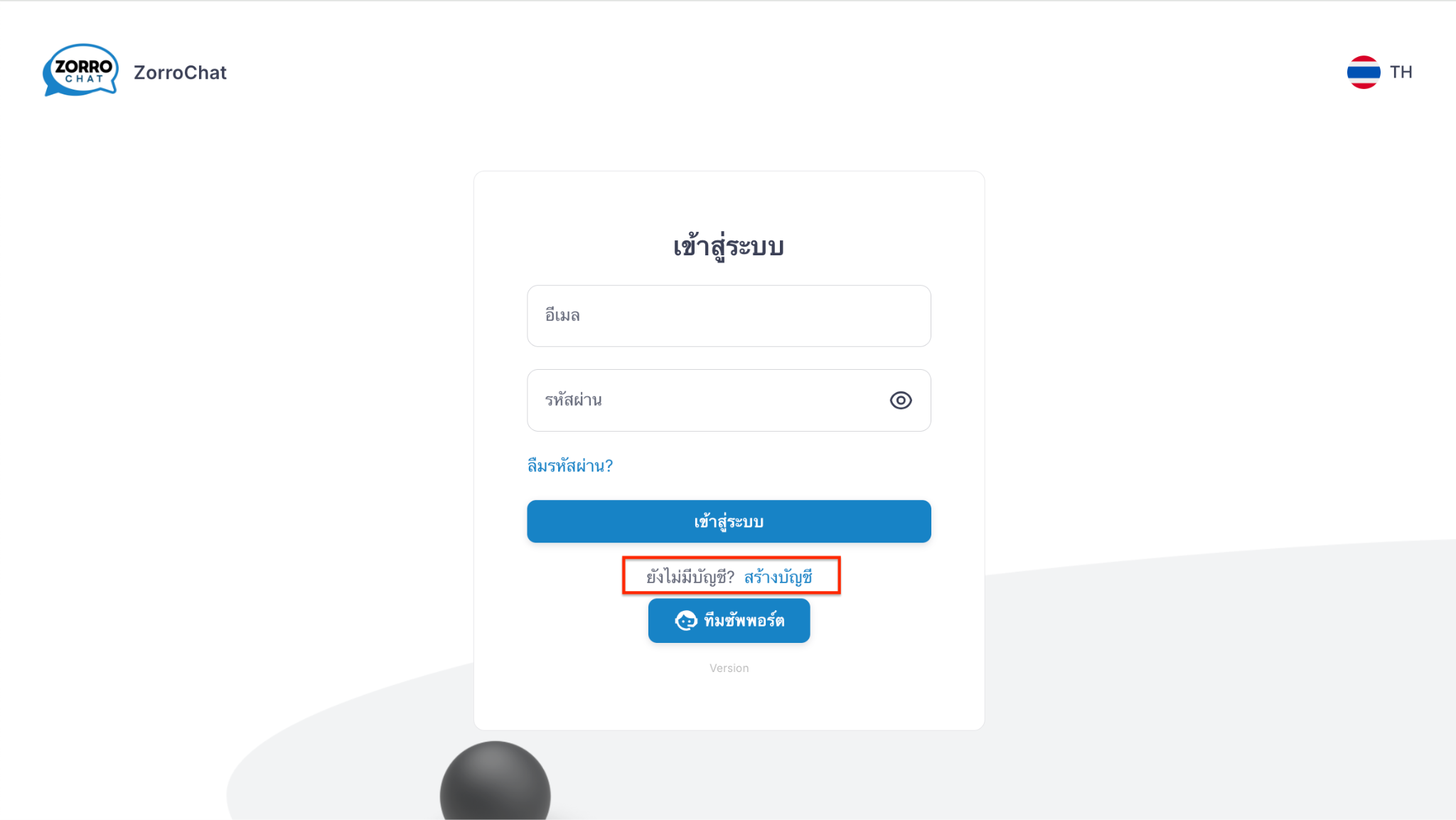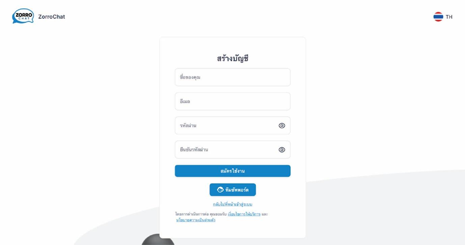 - กรอก URL: https://app.zorrochat.com แล้วกดปุ่ม “สร้างบัญชี” บนหน้าแรกของระบบ ZorroChat