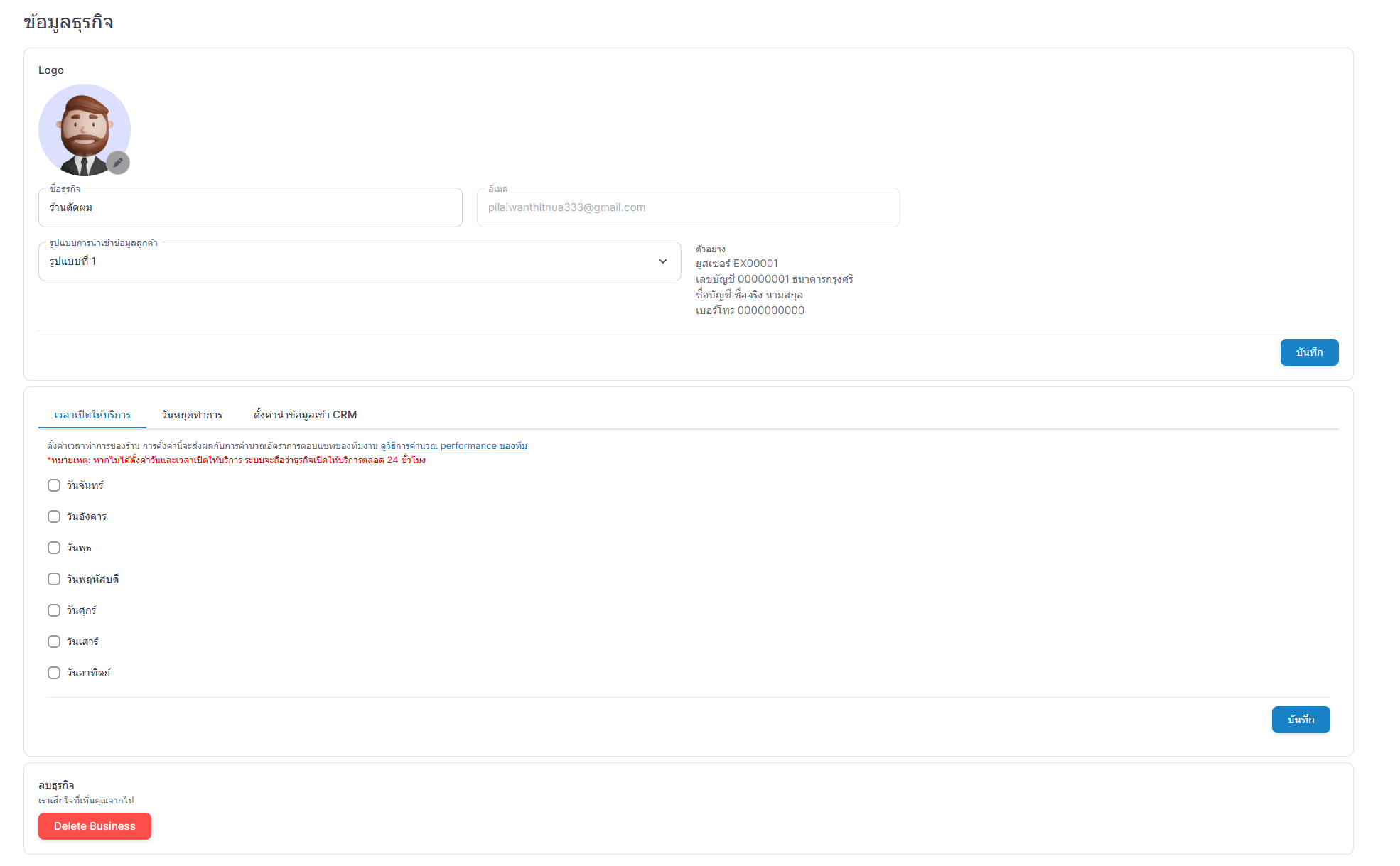 ไปที่ https://app.zorrochat.com/th/setting/business กดที่เมนู “ตั้งค่า” จากนั้นเลือกเมนู “ข้อมูลธุรกิจ” เพื่อดำเนินการตั้งค่าข้อมูลธุรกิจ