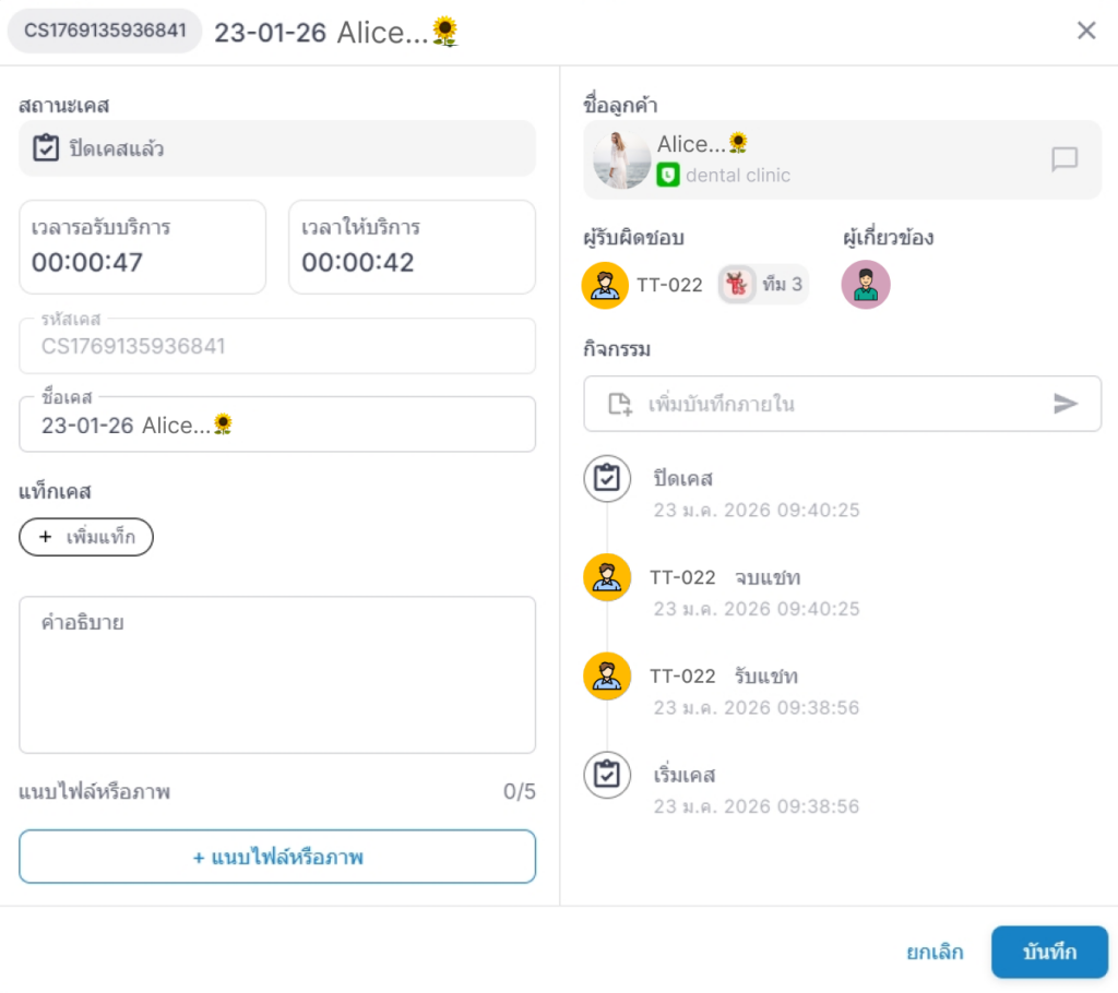 - คำอธิบาย: สำหรับเขียนรายละเอียดของเคสเพิ่มเติม เช่น ปัญหาที่พบ หรือสิ่งที่ต้องติดตาม