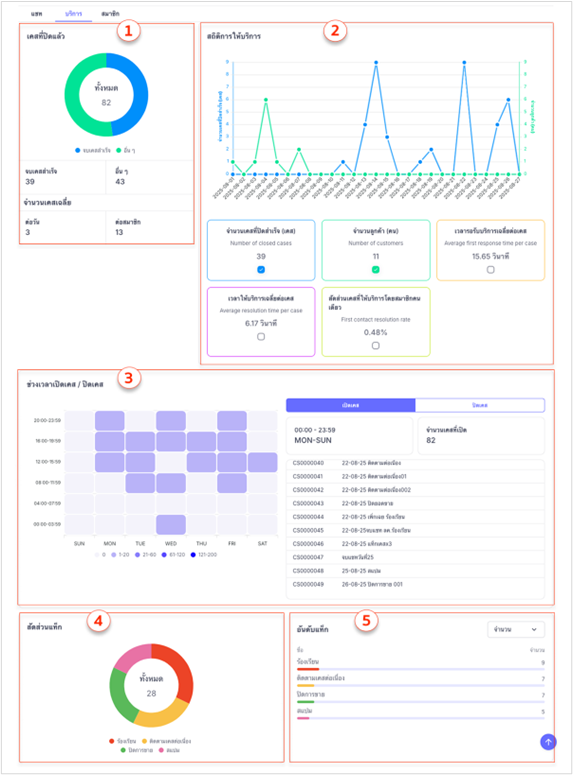 ใช้สำหรับแสดงข้อมูลภาพรวมด้านการให้บริการลูกค้า เพื่อติดตามคุณภาพการบริการและประสิทธิภาพการจัดการเคส โดยประกอบด้วยส่วนต่าง ๆ ดังนี้